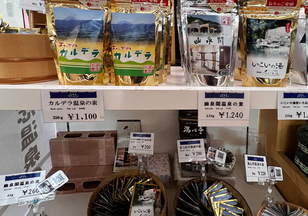 館内のお土産コーナーでは、赤井川村ならではの商品が並んでいました。特に人気だったのが「温泉の素」。
